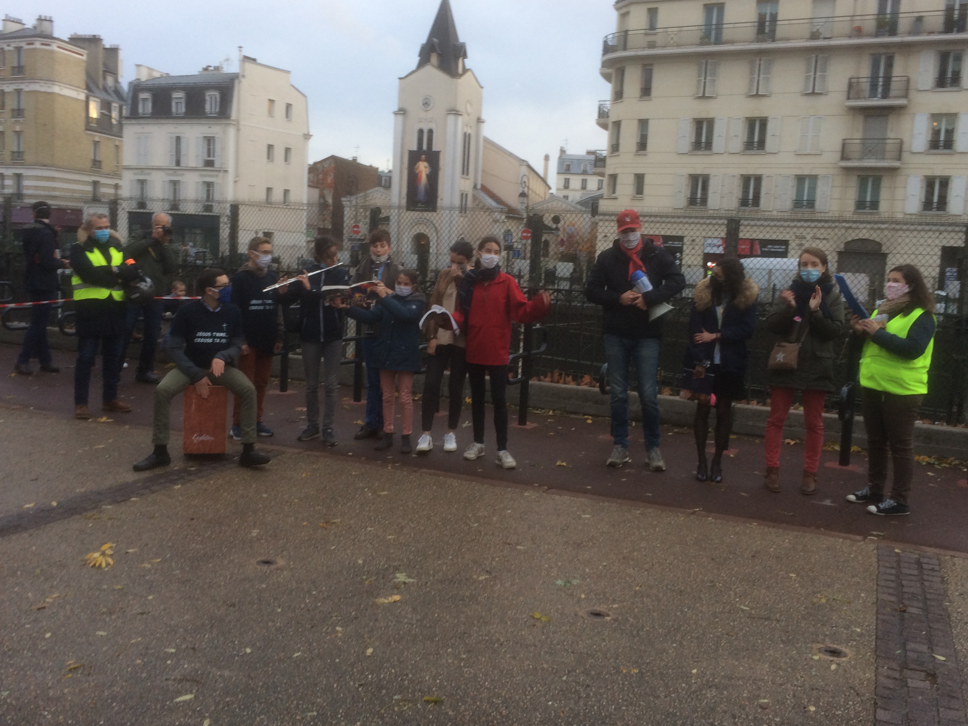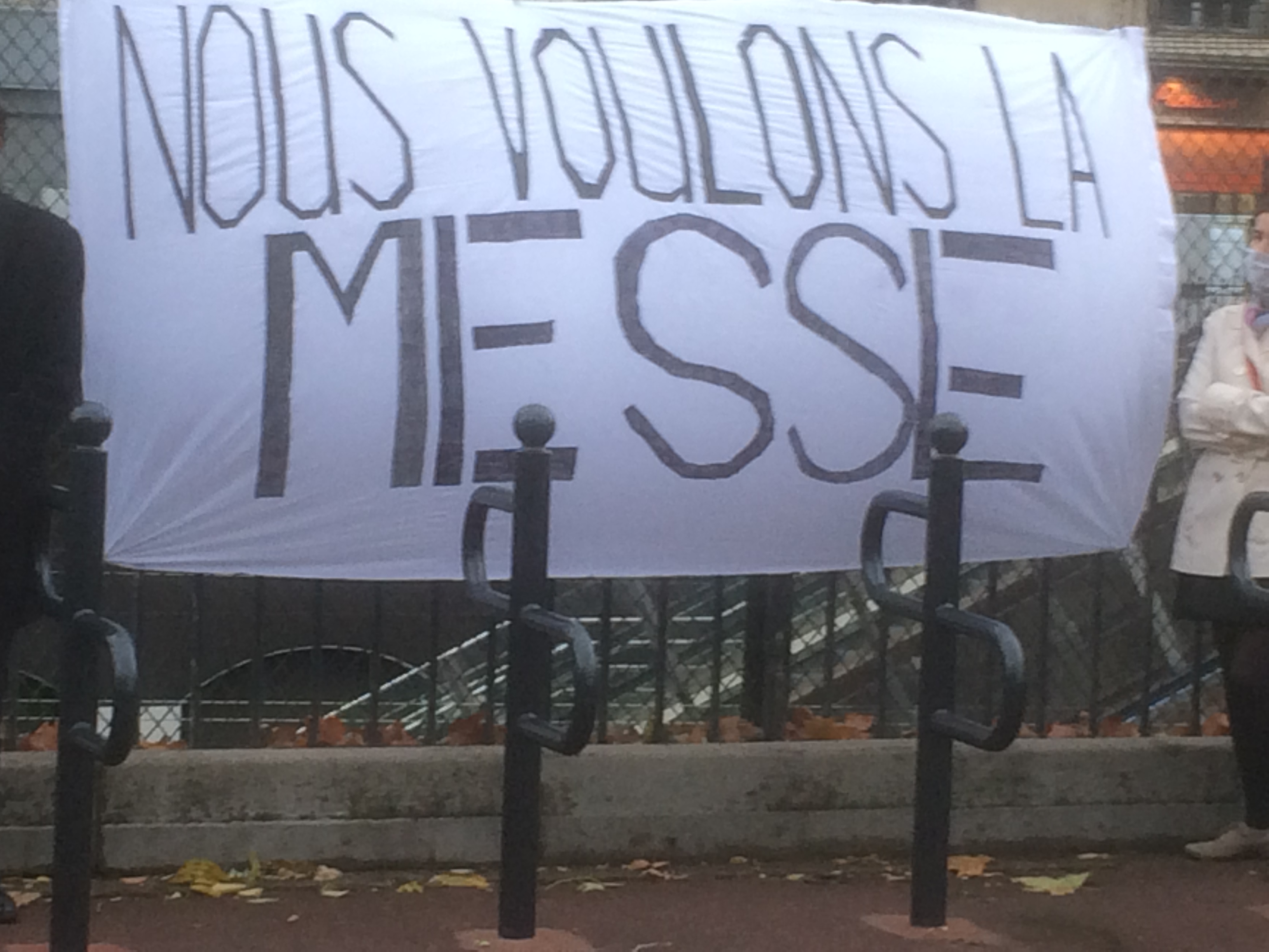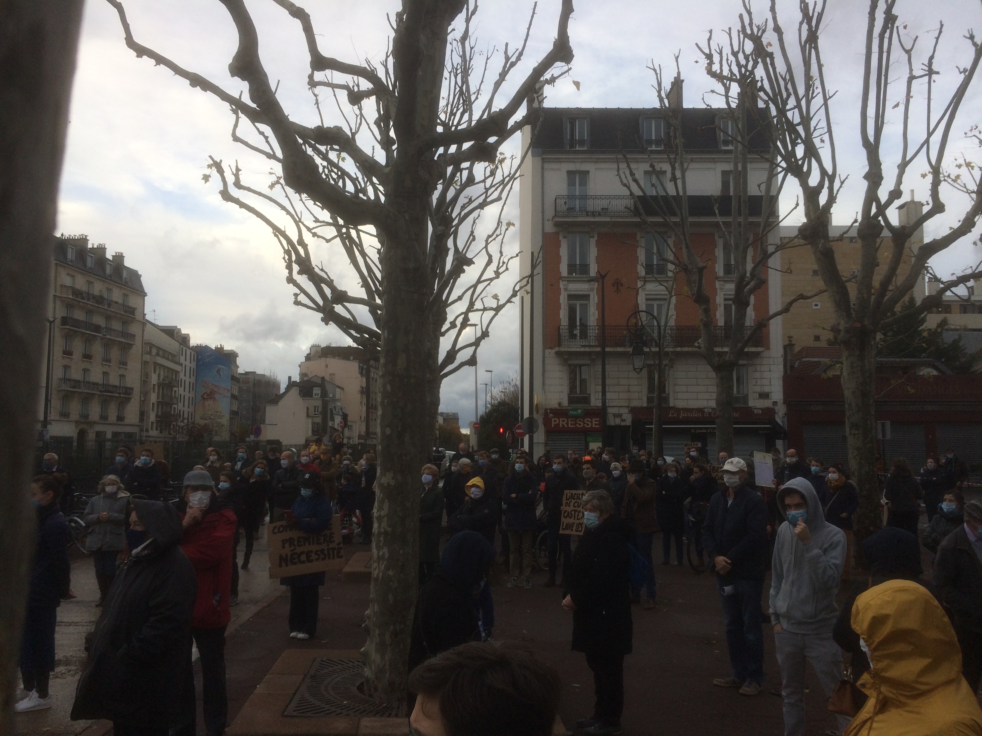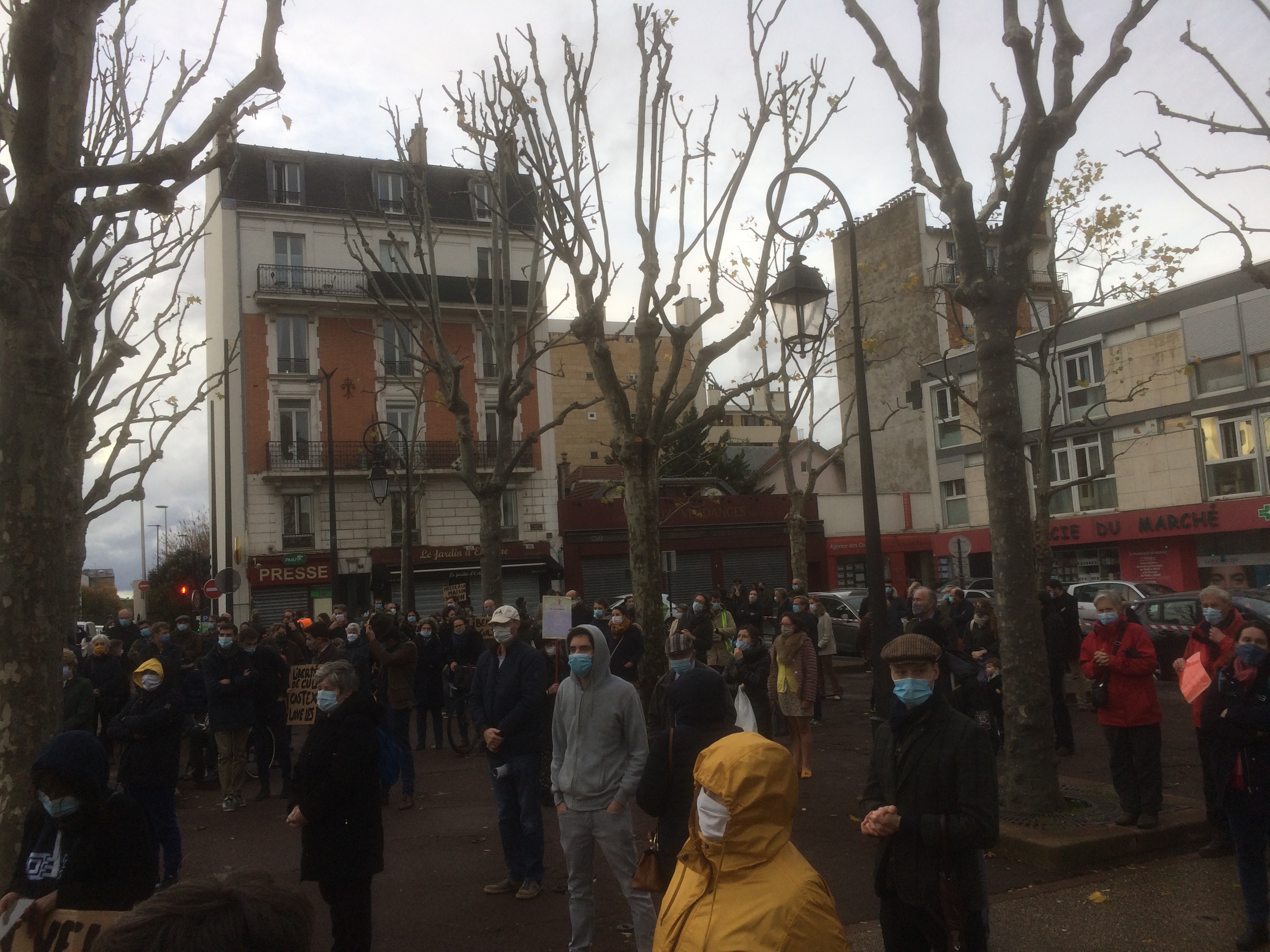 Entre 150 et 200 personnes sur la place du marché à Bois Colombes pour demander l’arrêt de l’interdiction des messes. Avec le respect des normes sanitaires comme cela a été le cas jusqu’à maintenant.