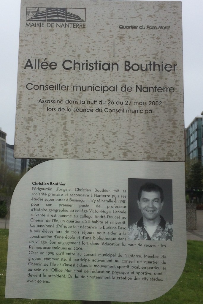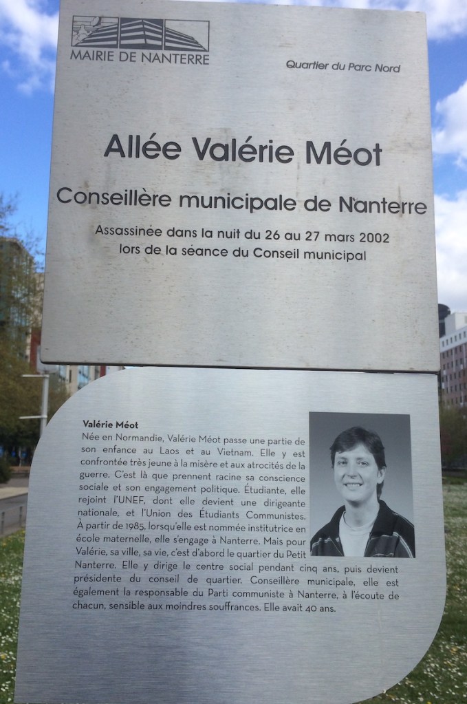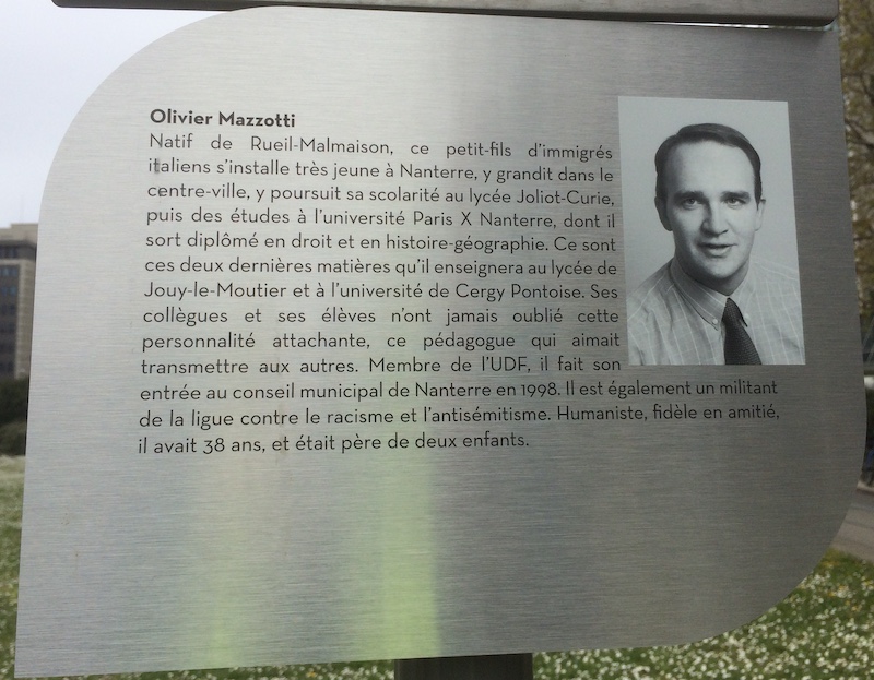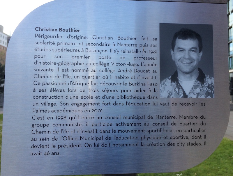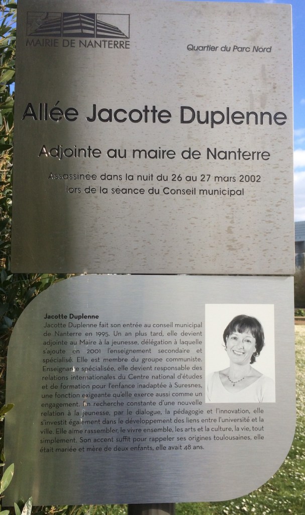 Nous pouvons faire leur connaissance en lisant leurs présentations, sur les stèles placées sous les panneaux des allées que la ville leur a consacrées, sur les terrasses de la Défense, à la sortie du métro Nanterre Préfecture. Leurs engagements étaient vécus comme un service. C’est un service dans lequel beaucoup donnent de leur temps et de leur énergie. Michel, Olivier, Monique, Jacotte, Christian, Louiza, Pascal et Valérie ont donné bien plus : leur vie, bien sûr, à leur corps défendant.