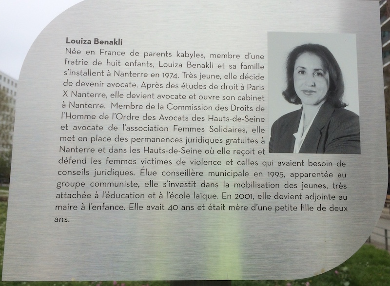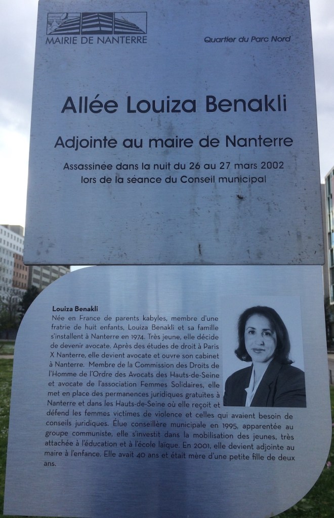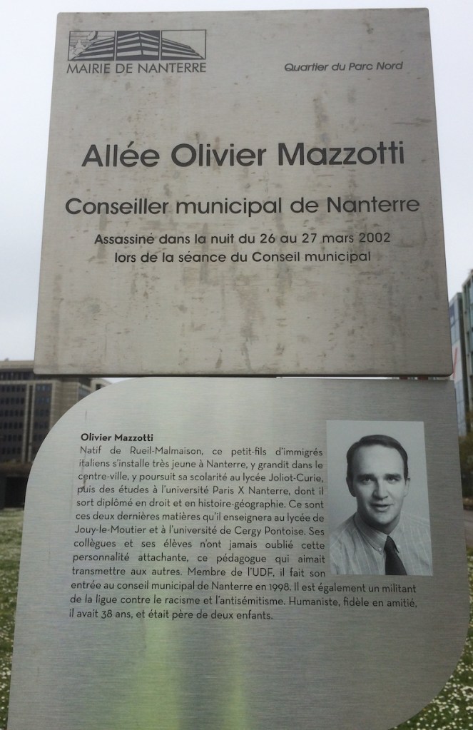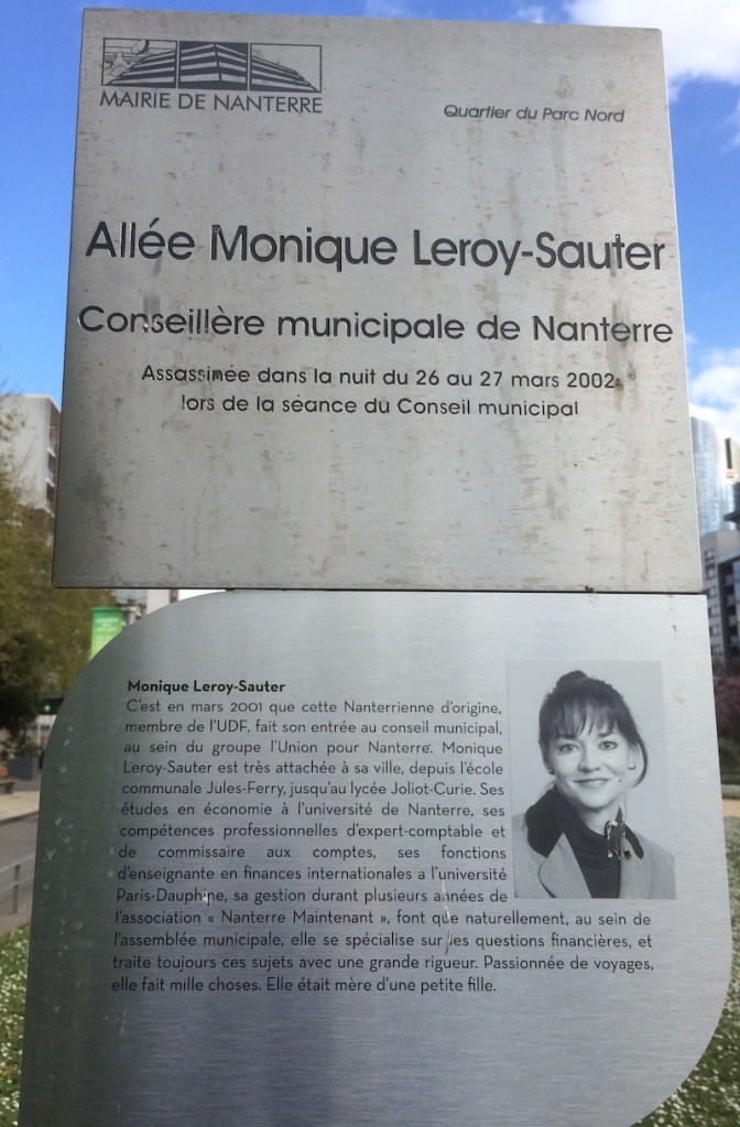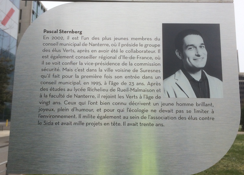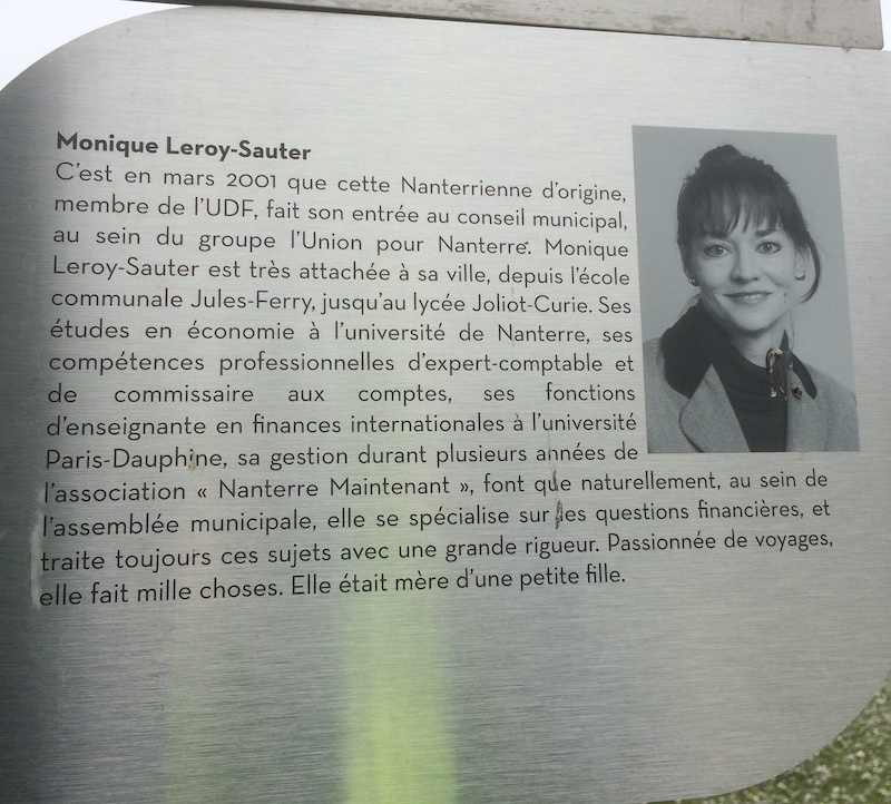 Nous pouvons faire leur connaissance en lisant leurs présentations, sur les stèles placées sous les panneaux des allées que la ville leur a consacrées, sur les terrasses de la Défense, à la sortie du métro Nanterre Préfecture. Leurs engagements étaient vécus comme un service. C’est un service dans lequel beaucoup donnent de leur temps et de leur énergie. Michel, Olivier, Monique, Jacotte, Christian, Louiza, Pascal et Valérie ont donné bien plus : leur vie, bien sûr, à leur corps défendant.