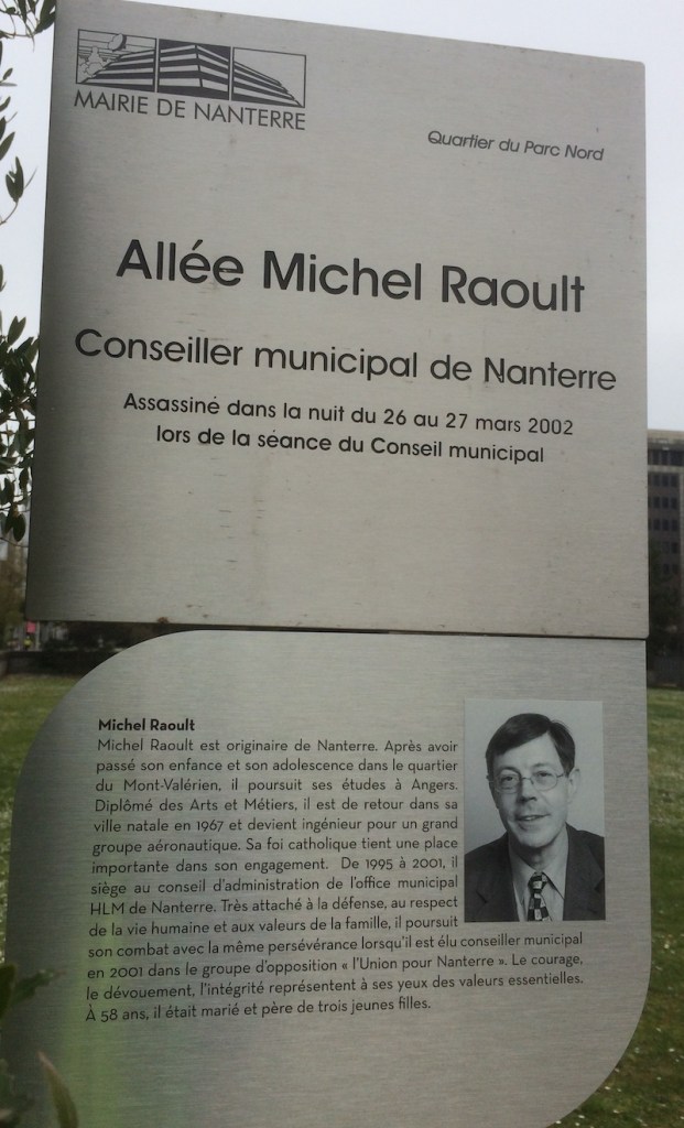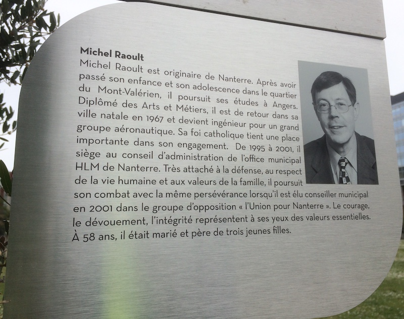 Michel Raoult est originaire de Nanterre. Après avoir passé son enfance et son adolescence dans le quartier du Mont-Valérien, il poursuit ses études à Angers. Diplômé des Arts et Métiers, il est de retour dans sa ville natale en 1967 et devient ingénieur pour un grand groupe aéronautique. Sa foi catholique tient une place importante dans son engagement. De 1995 à 2001 il siège au Conseil d’administration de l’Office Municipal HLM de Nanterre. Très attaché à la défense, au respect de la vie humaine et aux valeurs de la famille, il poursuit son combat avec la même persévérance lorsqu’il est élu conseiller municipal en 2001 dans le groupe d’opposition « l’Union pour Nanterre ». Le courage, le dévouement, l’intégrité représentent à ses yeux des valeurs essentielles. A 58 ans il était marié et père de 3 jeunes filles.